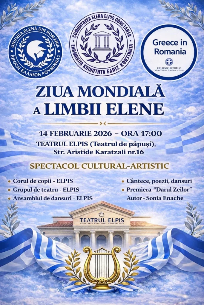 Astăzi la nivel mondial se sărbătorește Ziua Limbii Elene cu recunoștință pentru ceea ce a dat și adus lumii întregi în spiritul înțelegerii între popoare de orice neam. Ramura de măslin dăinuie ca simbol al păcii, atât de dorită de când există omenirea. Sâmbătă, 14 februarie, ora 17:00, Teatrul Elpis vă așteaptă cu drag să sărbătorim împreună Ziua Limbii Elene. Evenimentul cuprinde Corul de copii Elpis, Grupul de teatru Elpis, Ansamblul de dansuri Elpis, cântece, poezii, dansuri, și premiera „Darul Zeilor” cu autorul Sonia Enache. O sărbătoare a frumuseții și a spiritului elen care continuă să viețuiască în inima României.