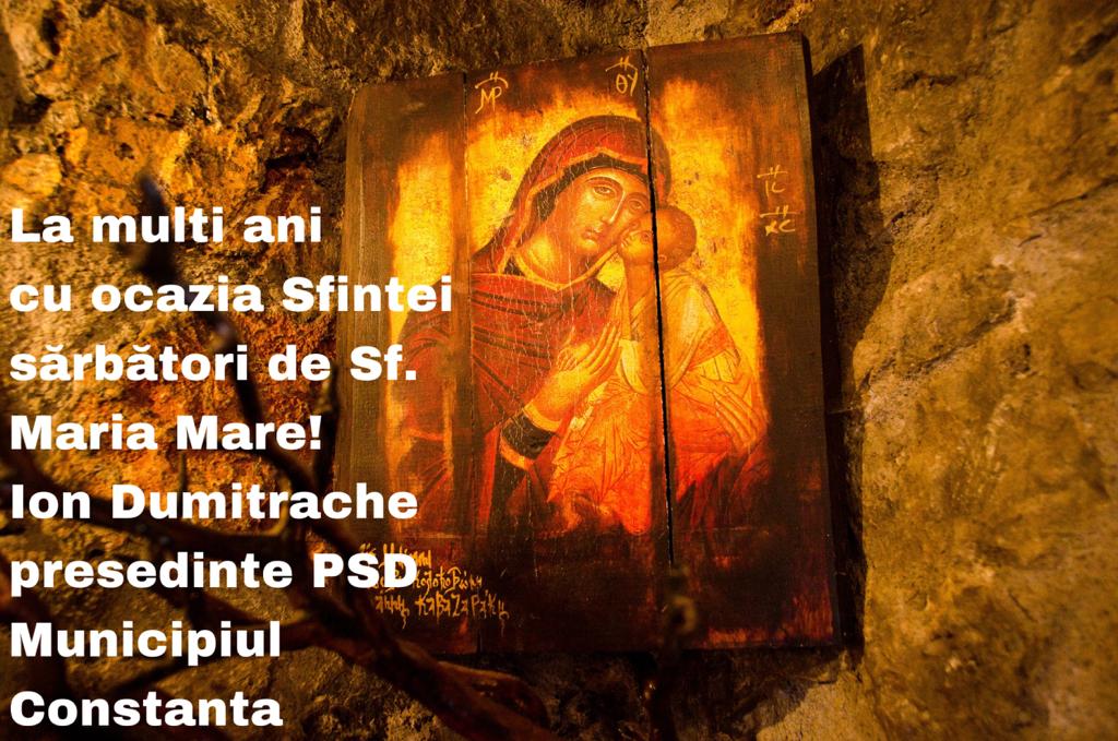 Cu ocazia sfintei sărbători a Adormirii Maicii Domnului, urez, în numele meu și al colegilor mei din Organizația Municipală PSD Constanța un sincer La Mulți Ani tuturor celor care poartă Sfântul nume!