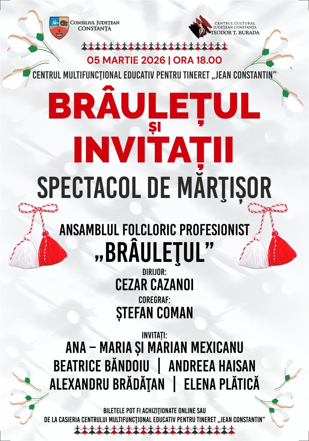 Centrul Cultural Județean Constanța „Teodor T. Burada”, cu sprijinul Consiliului Județean Constanța, invită publicul constănțean la spectacolul de Mărțișor „Brâulețul și invitații”, un eveniment dedicat tradițiilor românești și bucuriei de a celebra primăvara prin muzică și dans popular. Evenimentul va avea loc joi, 5 martie 2026, de la ora 18:00, la Centrul
