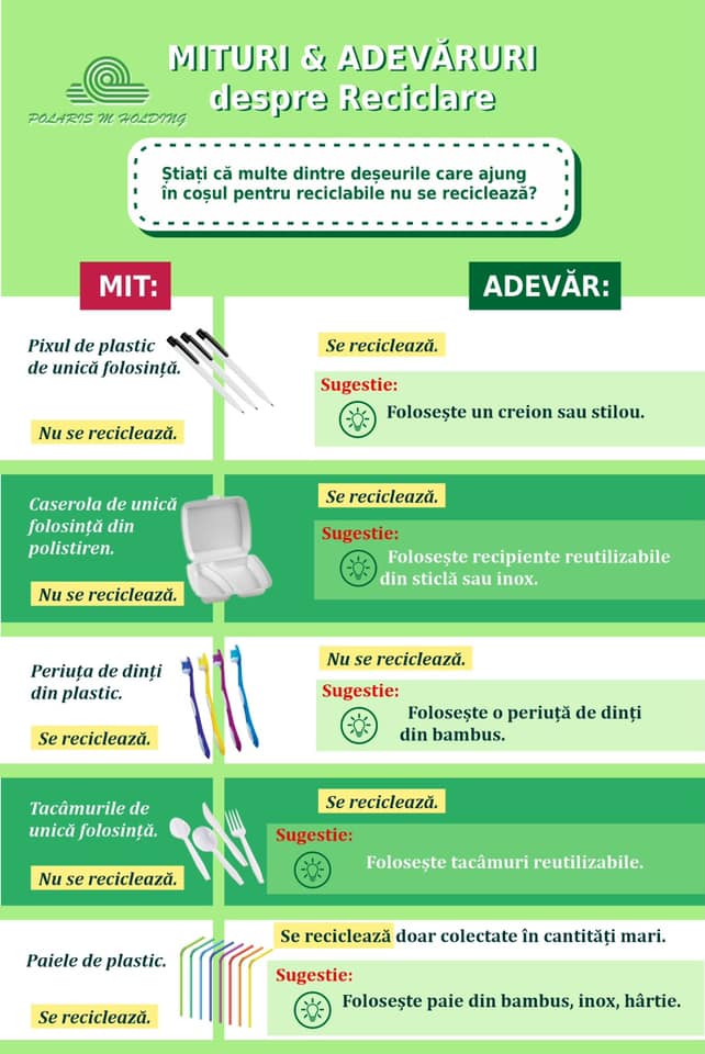 De multe ori, din dorința de a recicla mai mult, depunem în coșul pentru materiale reciclabile și deșeuri reziduale, care ajung să contamineze (ambalajele conțin alimente, sunt murdare de ulei) și deșeurile reciclabile, astfel că ajung la groapa ecologică mai multe deșeuri decât avem intenția. Din acest motiv am realizat o listă, pe care am denumit-o “mit vs adevăr”, care să ne ajute să colectăm corect deșeurile.