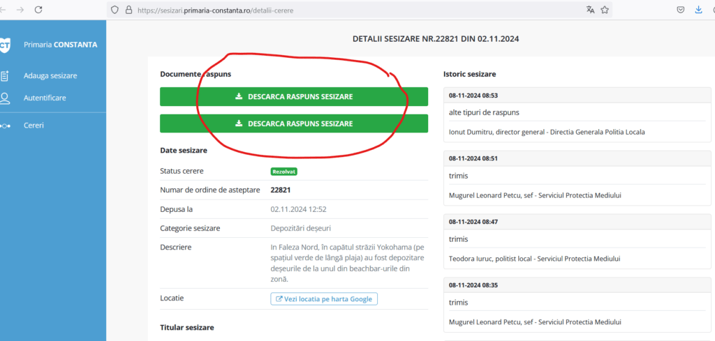 Un cetățean din Constanța a depus, ca mulți alții, o sesizare legată de depozitarea deșeurilor pe spațiul verde de lângă plaja din Faleză Nord. Cu poze, subiect și predicat, indicând chiar și cine și când. Depusă pe 2 noiembrie, trecută prin jde mii de mâini, așa cum arată lanțul trofic din răspunsul „primit”. În final, de la Ionuț Dumitru, director general – Direcția Generală Poliția Locală Constanța. În total 12 (douăsprezece) persoane. Răspunsul final are data de 8 noiembrie, deci foarte operativ!