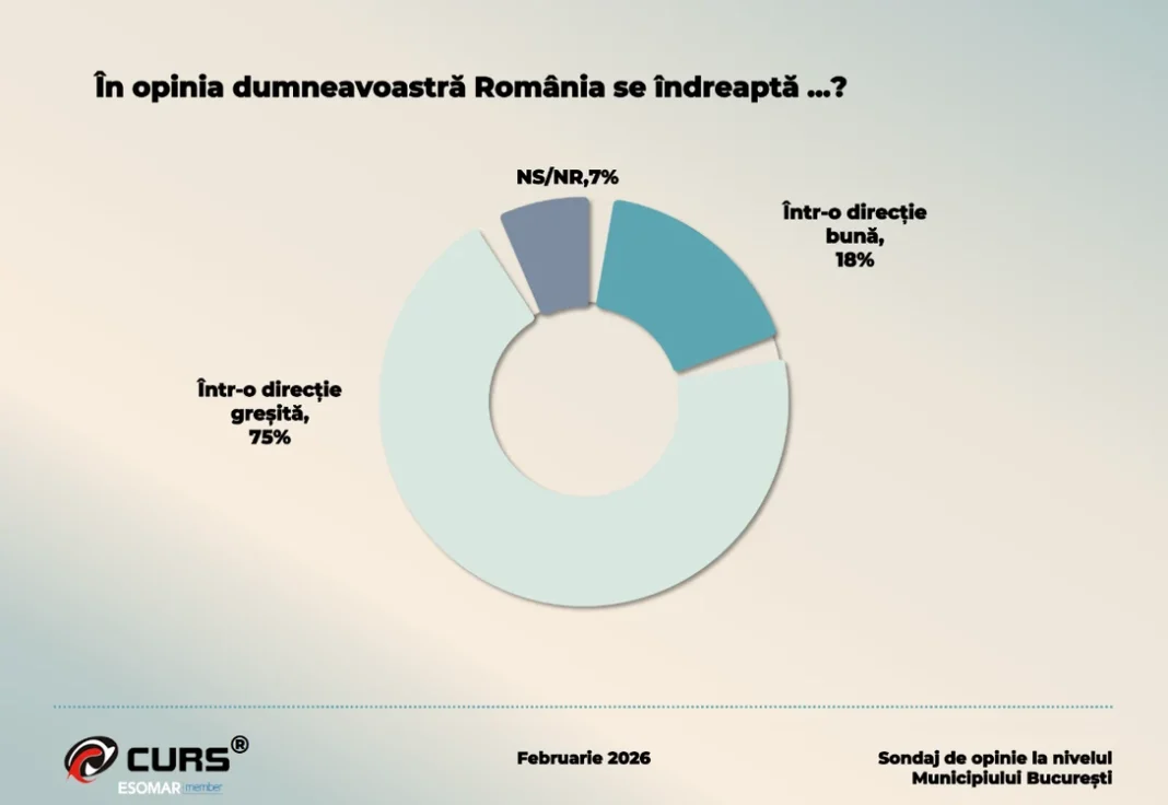 Trei sferturi dintre cei care au răspuns, 75%, consideră că România se îndreaptă într-o direcție greșită și doar 18% apreciază că direcția este una bună.
