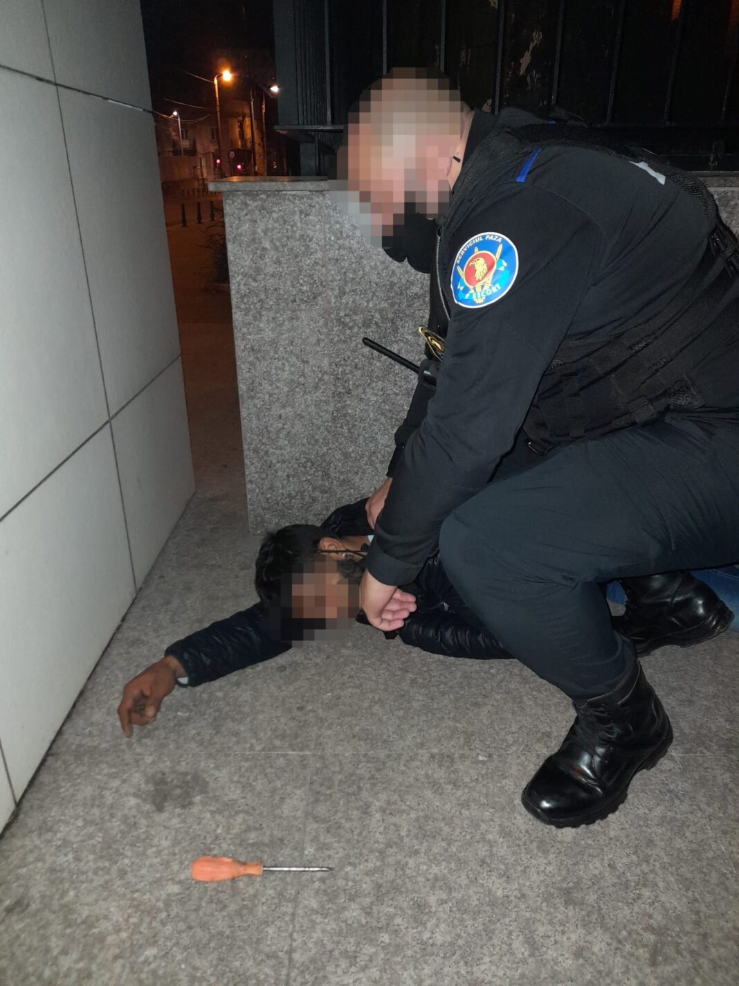 O dată ajunși, agenții Zip Escort au găsit un individ de aproximativ 30 de ani, care încerca să desprindă plăci de cupru din fațada oficiului, l-au imobilizat și au sunat echipajele de poliție să se prezinte la fața locului pentru începerea anchetei.